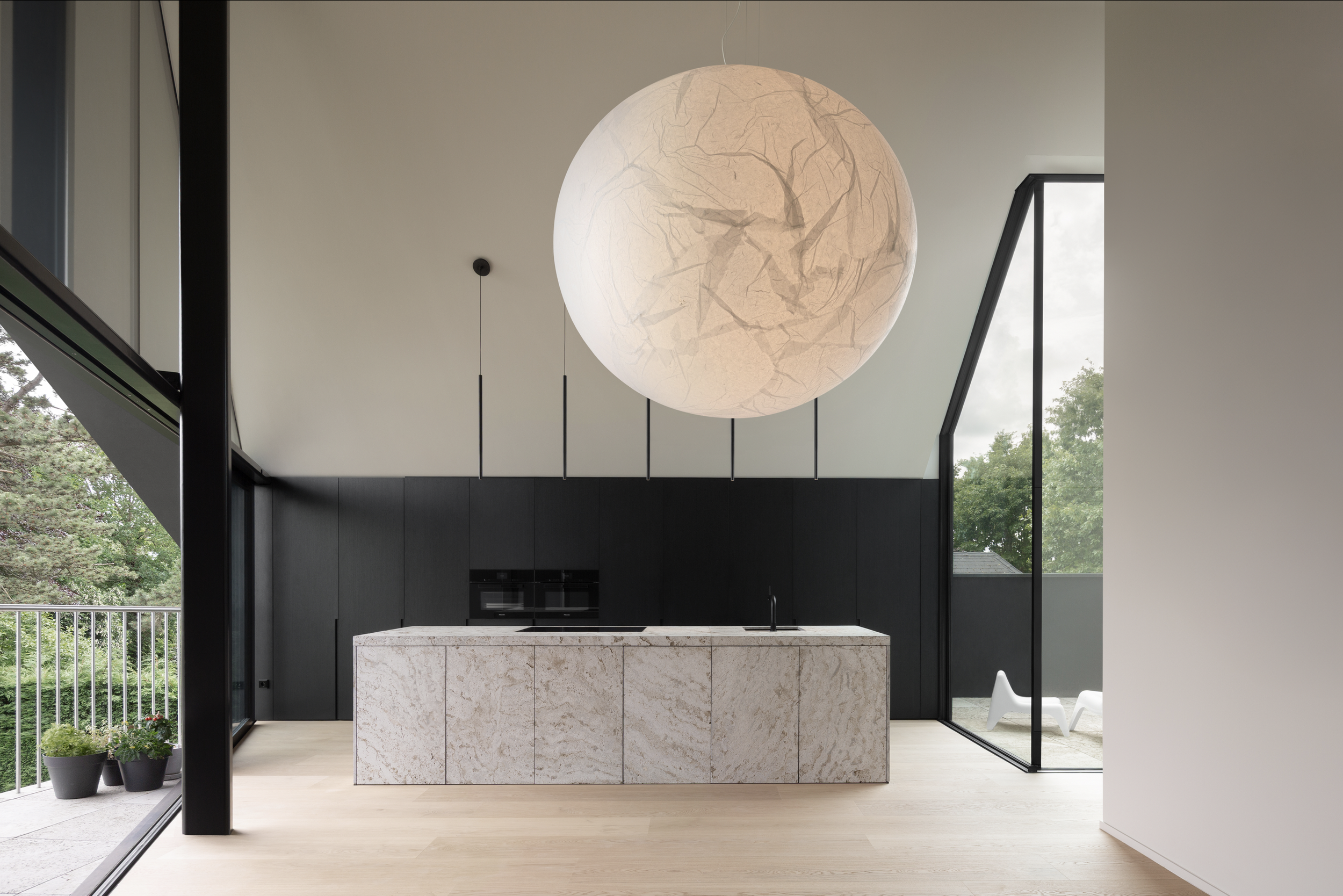 Modern kitchen with marble island, black wooden cabinets, and a spherical Moon lamp by Davide Groppi, opening to a terrace with white chairs, plants, and a large panoramic window overlooking nature