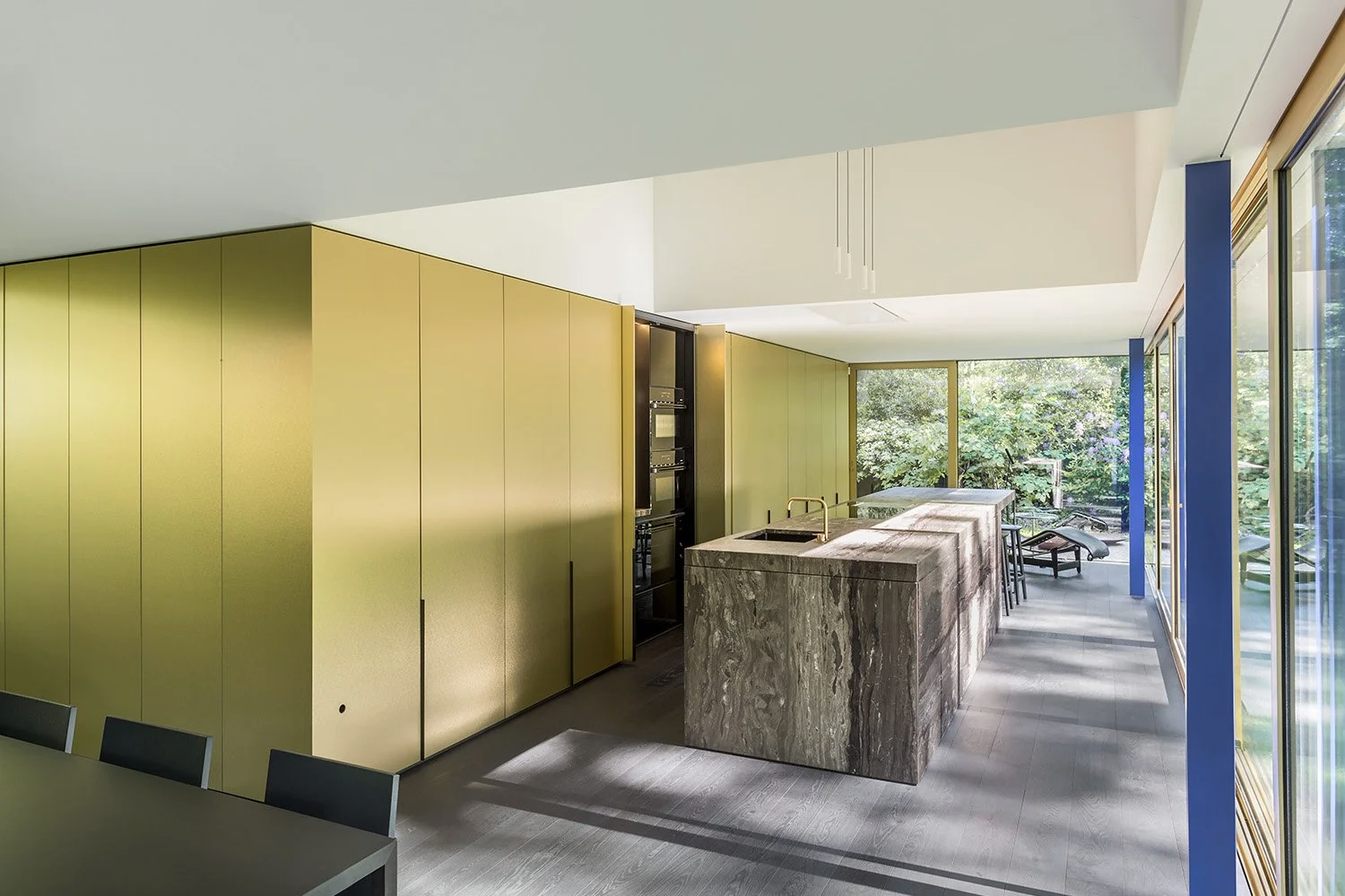 minimalistic bathroom with automation system lighting Davide Groppi. Natural light from large windows that open into a lush garden and a sauna. bath featuring VOLA taps and accessories crafted from solid brass, steel. Polished concrete floor